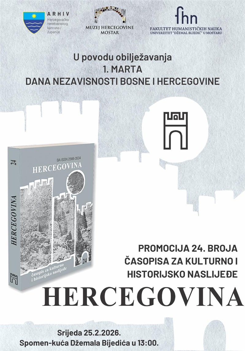 Povodom obilježavanja 1. marta, Dana nezavisnosti Bosne i Hercegovine, Arhiv Hercegovačko-neretvanskog kantona/županije, u saradnji sa Muzejom Hercegovine Mostar i Fakultetom humanističkih nauka Univerziteta „Džemal Bijedić“ u Mostaru, organizuje svečanu promociju 24. broja časopisa za kulturno i historijsko naslijeđe „Hercegovina“. Promocija će se održati u srijedu, 25. februara 2026. godine, u autentičnom ambijentu Spomen-kuće Džemala Bijedića u Mostaru, sa početkom u 13:00 sati.