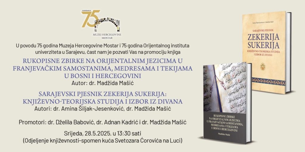 Promocija knjiga: “Rukopisne zbirke na orijetalnim jezicima u franjevačkim samostanima, medresama i tekijama u Bosni i Hercegovini” autora dr. Madžida Mašić, te “Sarajevski pjesnik Zekerija Sukerija: Književno-teorijska studija i izbor iz Divana” autora dr. Amina Šiljak-Jasenković i dr. Madžida Mašić održat će se u spomen kući Svetozara Ćorovića na Luci u srijedu, 28. 5. 20205. godine u 13:30 sati, povodom obilježavanja 75. godina Muzeja Hercegovine Mostar i 75. godina Orijentalnog instituta univerziteta u Sarajevu.