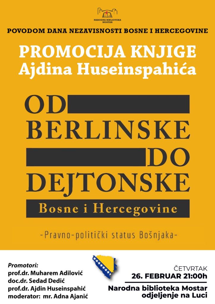 Povodom 1. marta, Dana nezavisnosti Bosne i Hercegovine, Narodna biblioteka Mostar (Odjeljenje na Luci) večeras u 21 sati organizuje promociju knjige “Od berlinske do dejtonske Bosne i Hercegovine : pravno-politički status Bošnjaka” autora prof.dr. Ajdina Huseinspahića.