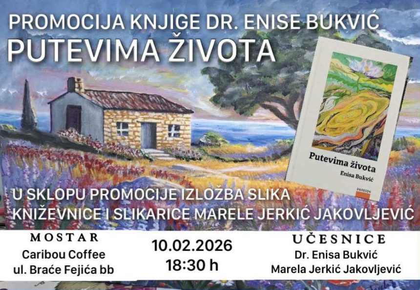 Promocija knjige “Putevima života” autorice dr. Enise Bukvić, bit će upriličena danas u 18.30 sati u prostorijama Caribou Coffee, Ulica Braće Fejića bb u Mostaru. U sklopu promocije planirana je i izložba slika književnice i slikarice Marele Jerkić Jakovljević.