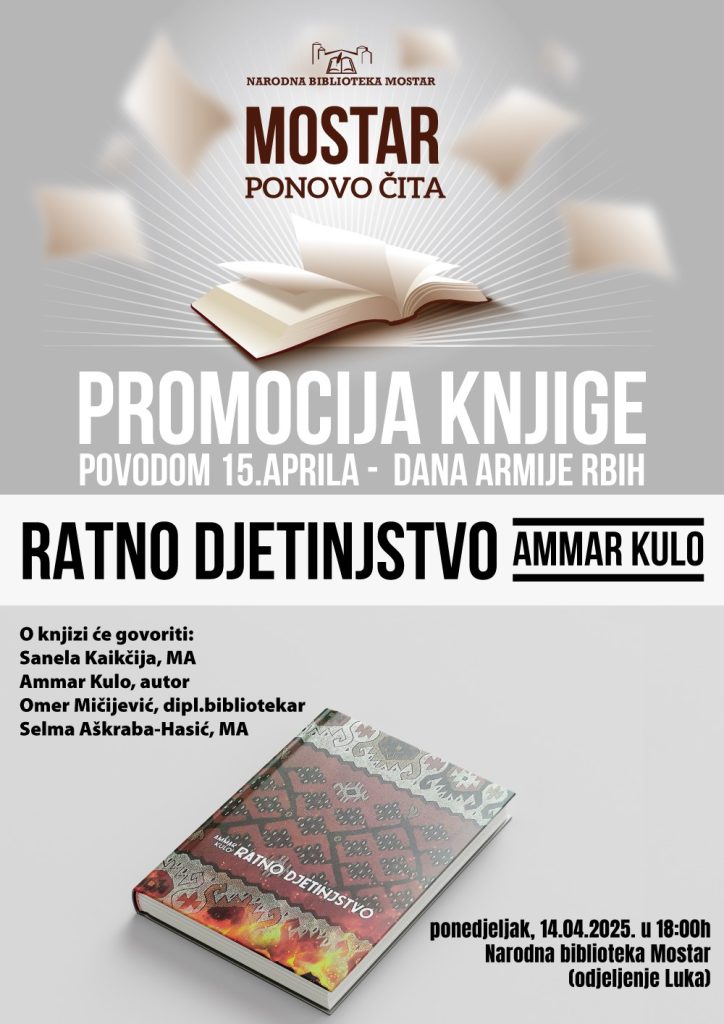 Promocija knjige “Ratno djetinjstvo” Ammara Kule, povodom 15. aprila Dana Armije RBiH, bit će upriličena danas u 18 sati u prostorijama Kluba čitalaca Narodne biblioteke Mostar.