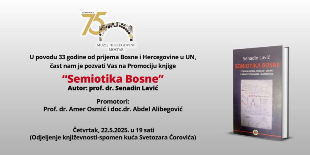 Promocija nove knjige “Semiotika Bosne” (2025) profesora Senadina Lavića, u organizaciji Muzeja Herecgvoine Mostar, , bit će upriličena u četvrtak 22. 5. 2025. godine u 19 sati u Odjeljenju književnosti -spomen kuća Svetozara Ćorovića.