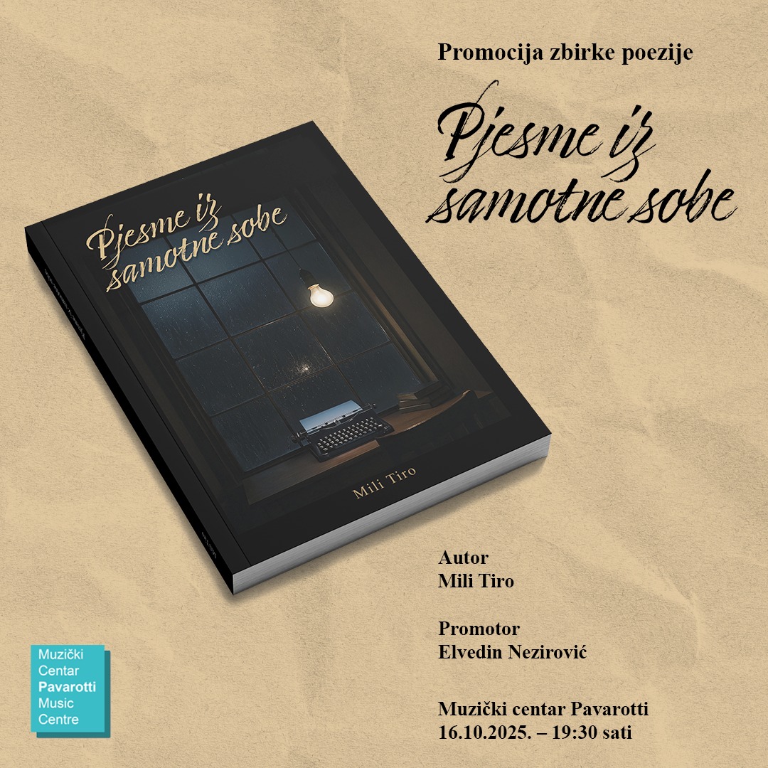 Ciklus književnih večeri, Pavarotti centar nastavlja promocijom zbirke pjesama „Pjesme iz samotne sobe“, čiji je autor Mili Tiro. Ovaj pjesnik je za svoje poetske radove već nagrađivan, a ovo je njegova druga zbirka poezije.