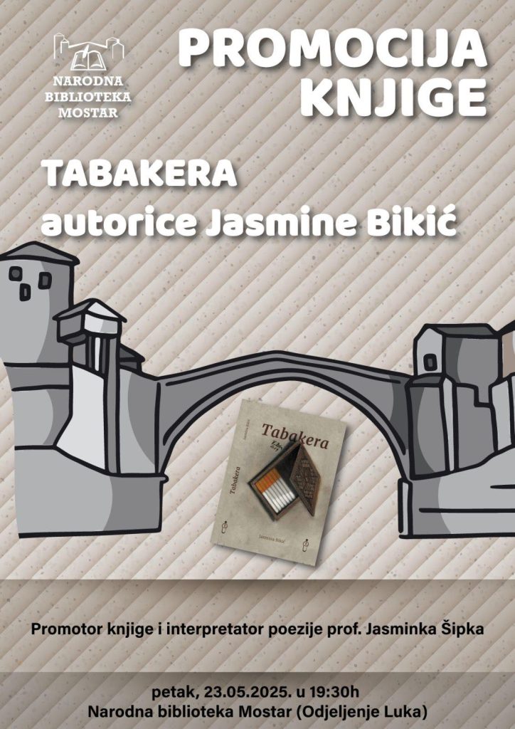Promocija poetskog prvijenca Jasmine Bikić “Tabakera” u izdanju renomirane bh. Izdavačke kuće Buybook, recenzenata prof. i umjetnice Indire Kučuk Sorguč i književnika Fahrudina Kučuka, bit će upriličena večeras u 19:30 sati u Narodnoj biblioteci Mostar na Luci.