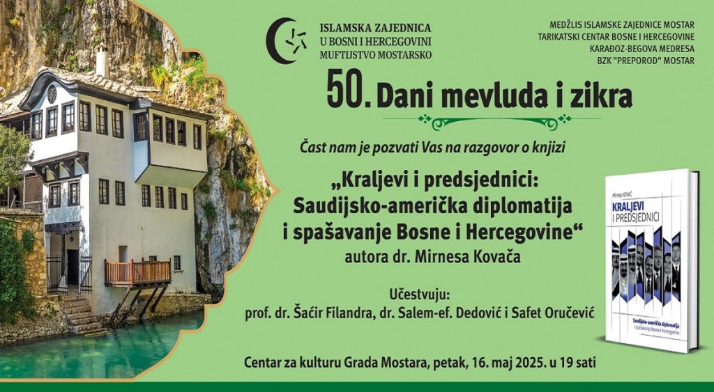 Razgovor o knjizi „Kraljevi i predsjednici: Saudijsko-američka diplomatija i spašavanje Bosne i Hercegovine“ autora dr. Mirnesa Kovača, bit će upriličen večeras u19 sati u Centru za kulturu Mostar, u sklopu tradicionalne 50. vjersko-kulturne manifestacije “Dani mevluda i zikra”.