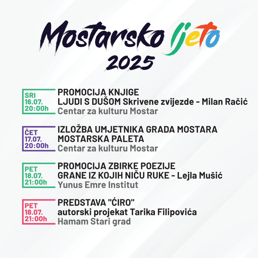 Raznovrsni sadržaji posjetioce očekuju i ove sedmice u okviru Međunarodne kulturne manifestacije “Mostarsko ljeto 2025”.