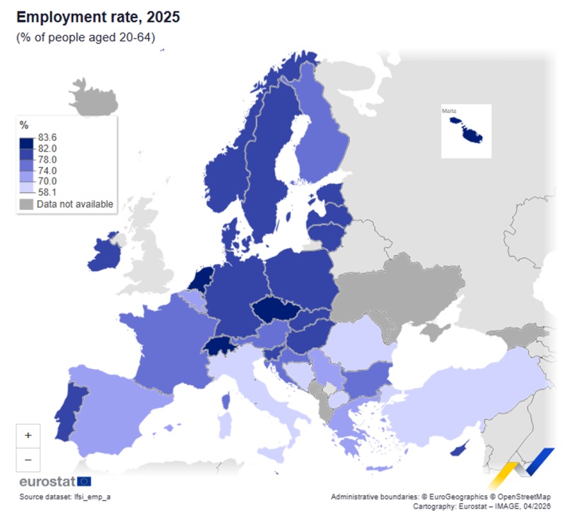 Najvišu zaposlenost zabilježile su Malta (83,6 posto), Nizozemska (83,4) i Češka (82,9), dok su najniže stope imale Italija (67,6), Rumunija (69) i Grčka (71 posto).