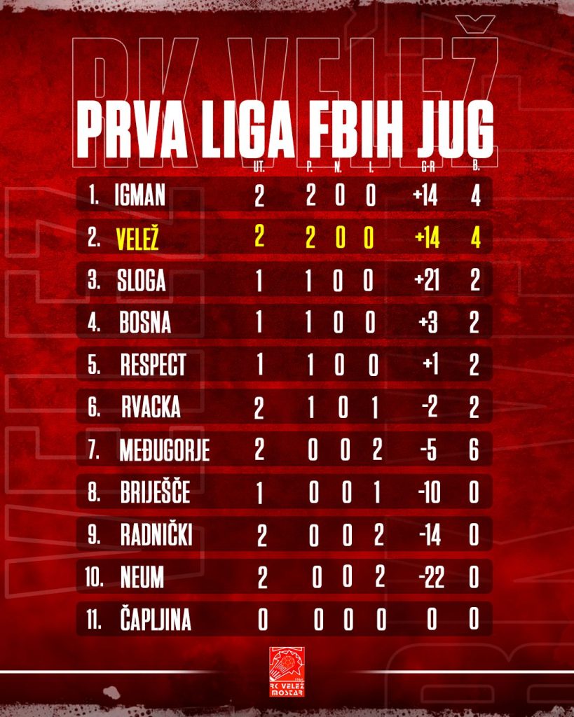 Rukometni klub (RK) Velež savladao je ekipu RK Radnički rezultatom 36:26, u okviru 2. kola Prve lige FBiH – grupa Jug!