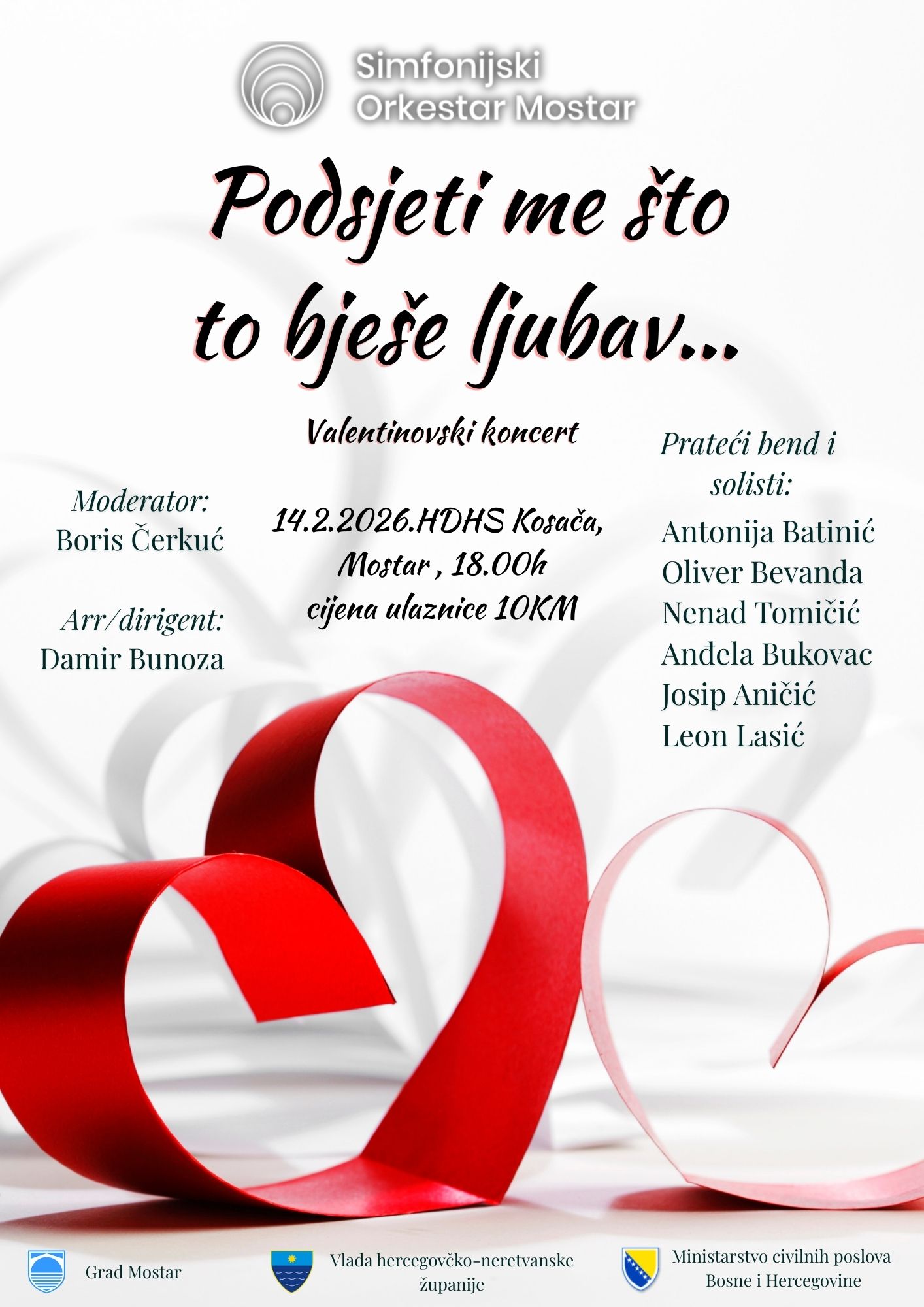 “Dođite i uživajte u bezvremenskim evergreenima i baladama koje su obilježile generacije.Uz orkestar i prateći bend, romantičnu atmosferu upotpunit će solisti Antonija Batinić, Oliver Bevanda, Nenad Tomičić, Anđela Bukovac, Josip Aničić i Leon Lasić. Aranžmane i dirigentsku palicu potpisuje Damir Bunoza” saopšteno je iz Simfonijskog orkestra Mostar.