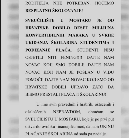 ”Sveučilište u Mostaru je od Hrvatske dobilo deset miliona konvertibilnih maraka u svrhe ukidanja školarina studentima i podizanje plaća. Studenti nisu osjetili niti fening!!!! Dajte nam novac koji smo dobili! Dajte nam novac koji nam je poslan u vidu pomoći! Dajte nam novac koji smo od Hrvatske dobili upravo zato da bismo prestali plaćati školarinu!”, stoji u pismu uokvirenom u video formu, koje se širi društvenim mrežama.