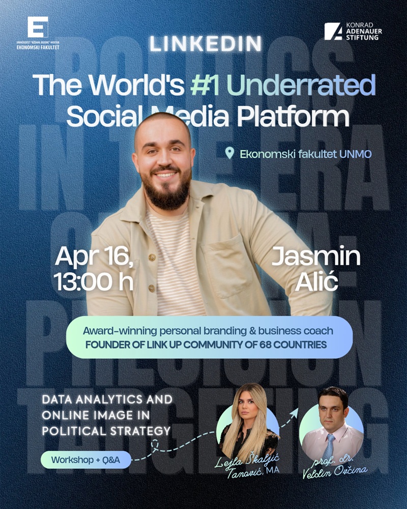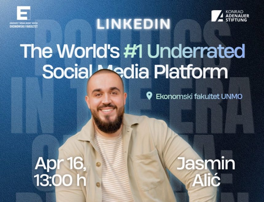 “Alić ima impresivnu karijeru – dobitnik je nagrade za lični branding, poslovni coach i osnivač LinkUp zajednice koja danas okuplja članove iz 68 zemalja svijeta.  Tema predavanja – LinkedIn: The World's #1 Underrated Social Media Platform – postavlja provokativno pitanje: Zašto najveća profesionalna mreža na svijetu i dalje ostaje nedovoljno iskorištena? Alić će kroz konkretne primjere i direktnu interakciju s publikom pokazati kako LinkedIn može biti odlučujući alat za razvoj karijere, poslovanja i ličnog brenda – bez obzira jeste li student, poduzetnik ili profesionalac”, ističu sa Ekonomskog fakulteta Univerziteta “Džemal Bijedić”.