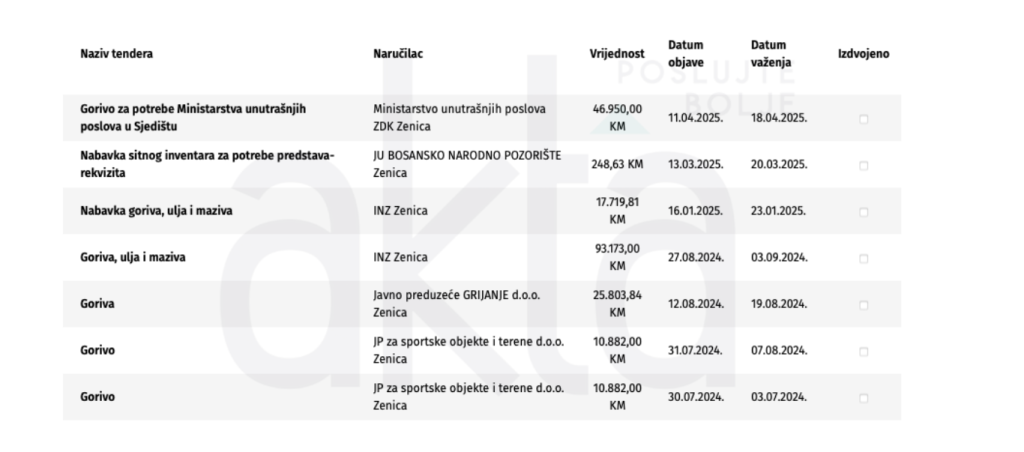 Među najznačajnijim su posao za INZ Zenica vrijedan više od 93 hiljade KM (bez PDV-a), tender od JP “Grijanje” Zenica od skoro 26 hiljada KM, kao i posao za JP za upravljanje sportskim objektima Zenica vrijedan blizu 11 hiljada KM.