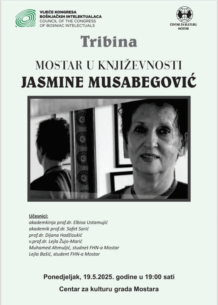 Tribina pod nazivom “Mostar u književnosti Jasmine Musabegović”, u organizaciji Vijeća kongresa bošnjačkih intelektualaca (VKBI) bit će upriličena večeras u 19 sati u Centru za kulturu Mostar.