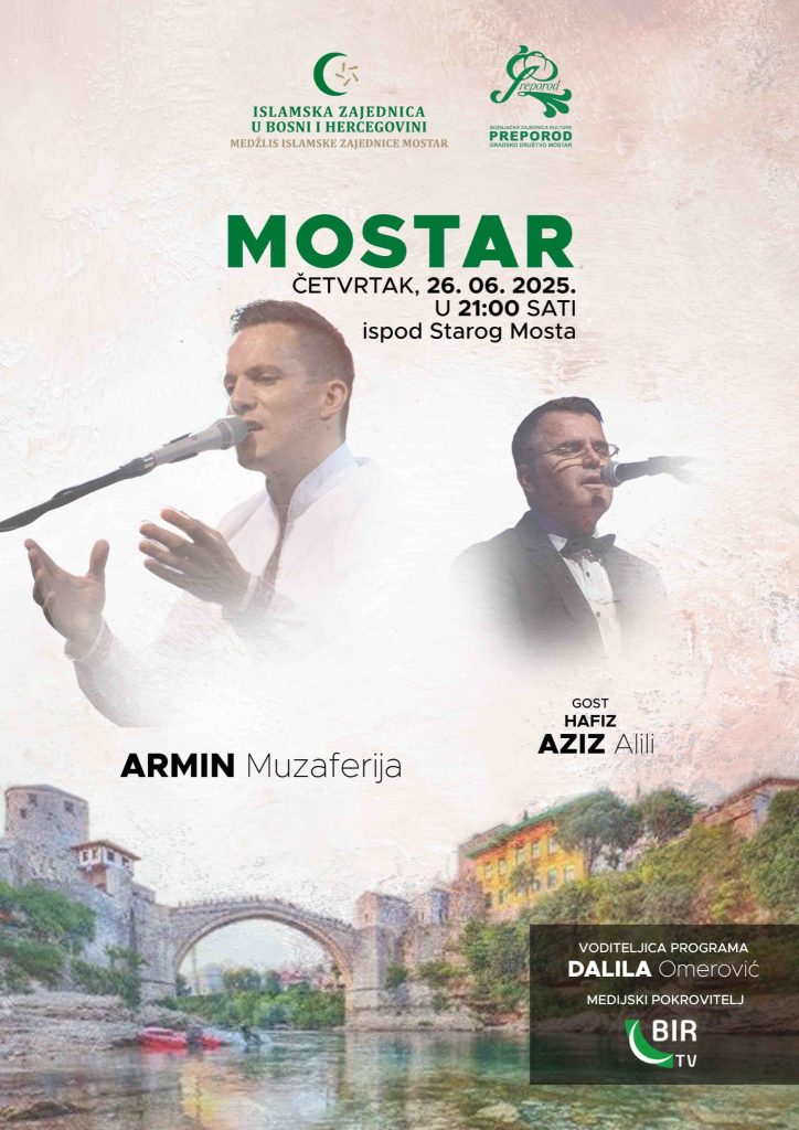U organizaciji Medžlisa Islamske zajednice Mostar i Bošnjačke zajednice kulture „Preporod“ Gradsko društvo Mostar povodom Nove hidžretske 1447. godine u četvrtak 26. juna u 21 sat, bit će upriličen koncert duhovne muzike Armina Muzaferije.