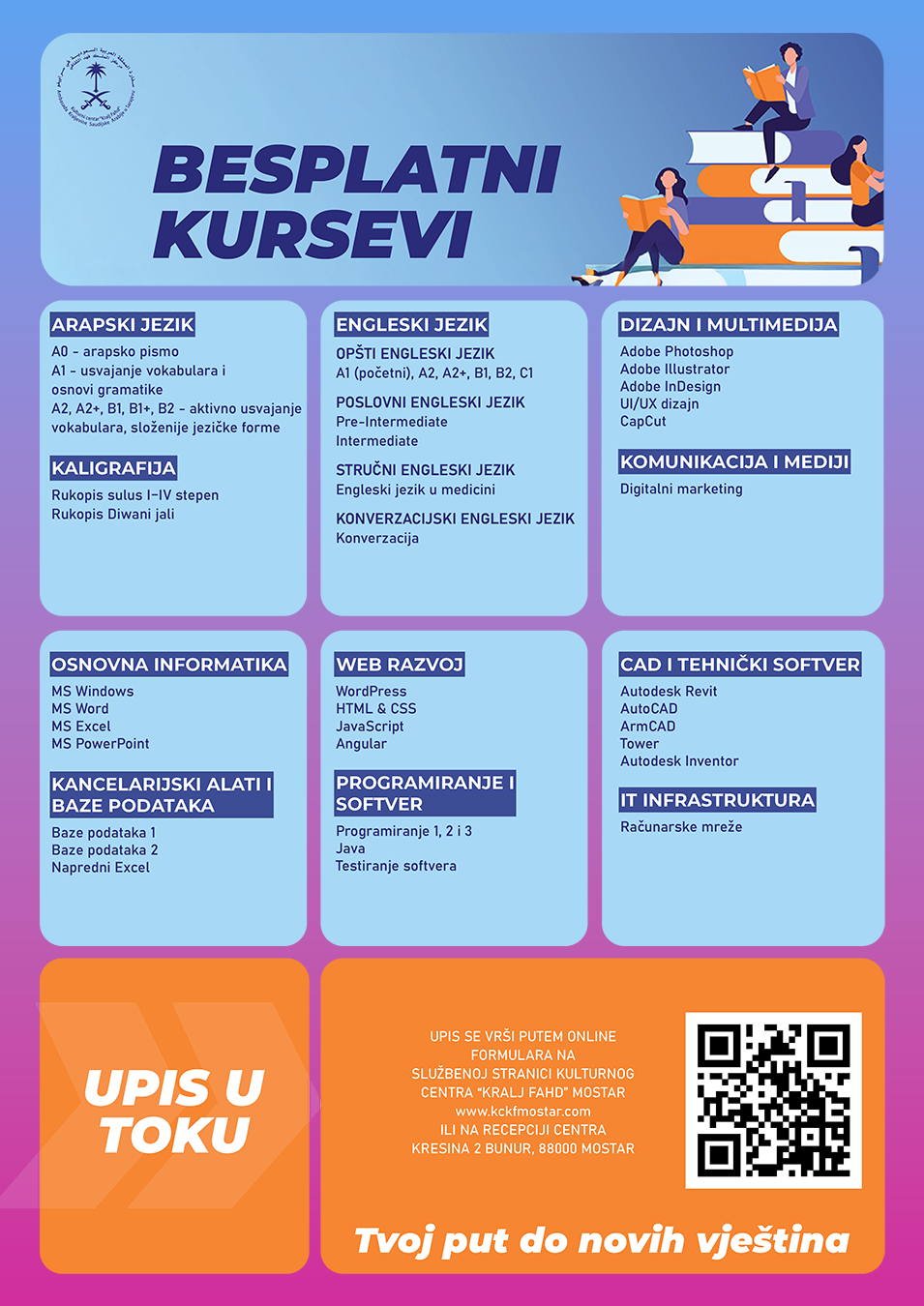 U Kulturnom centru “Kralj Fahd” Mostar otvorene su prijave za novi ciklus besplatnih kurseva, koje se organizuju s ciljem podsticanja dodatnog obrazovanja, sticanja novih znanja i usavršavanja praktičnih vještina.