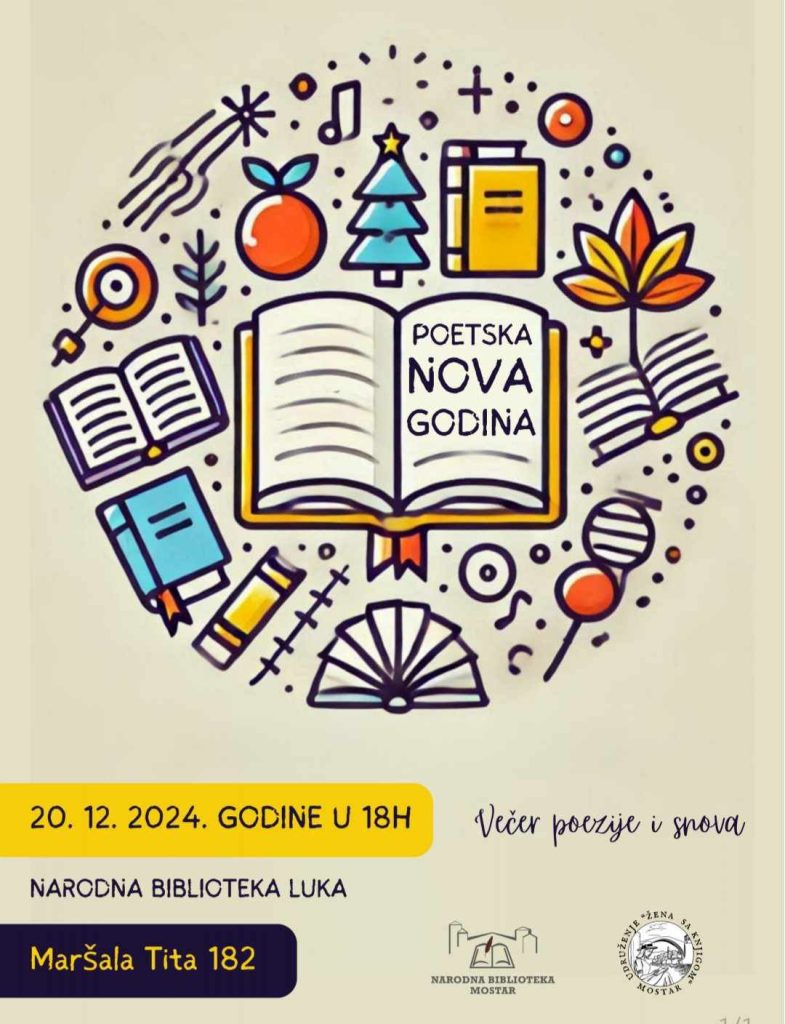 Poetsko veče pod nazivom “Poetska Nova godina”, u organizaciji Udruženja “Žena sa knjigom” i Narodne biblioteke Mostar, bit će upriličeno večeras u 18 sati u Narodnoj biblioteci Mostar (Odjeljenje na Luci).