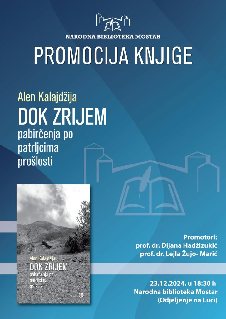 Promocija knjige “Dok zrijem: pabirčenja po patrljcima prošlosti” autora Alena Kalajdžije, bit će upriličena večeras u 18:30 sati u Narodnoj biblioteci Mostar, Odjeljenje na Luci.