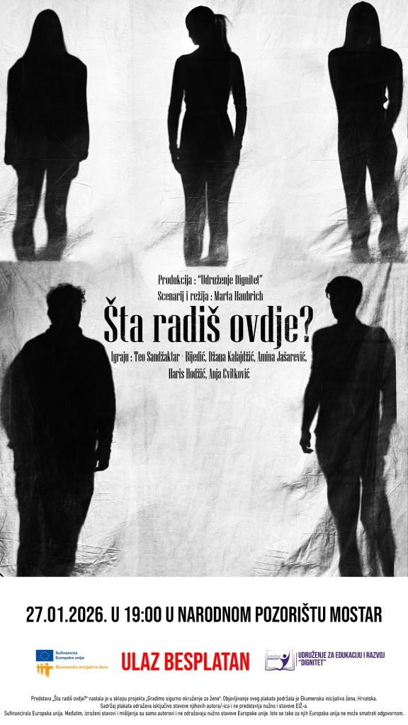 Već sutra, utorak, 27.01. 2026. godine u 19 sati, bit će upriličena premijerna izvedba predstave „Šta radiš ovdje?“ nastale u produkciji Udruženja Dignitet.