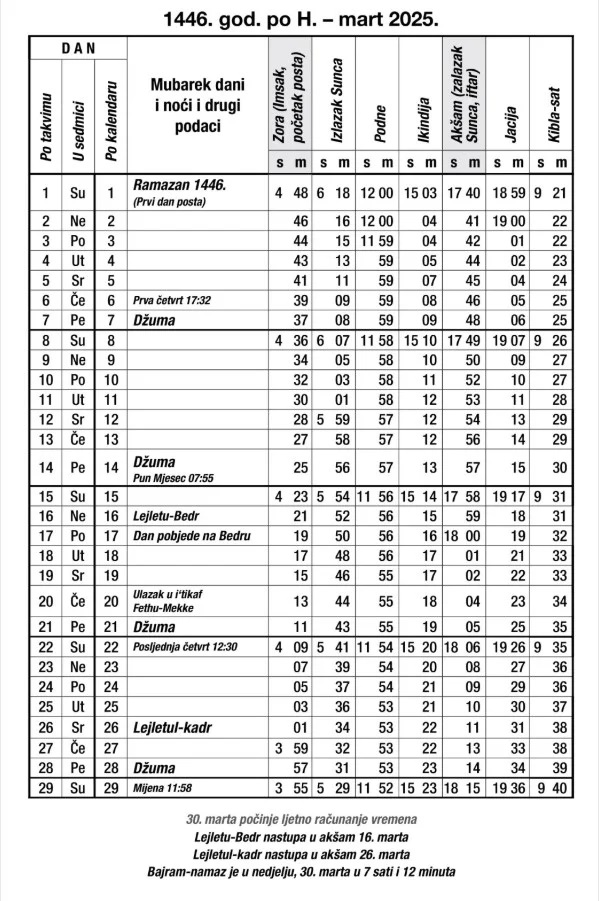 Prema vaktiji za Sarajevo, sehur (početak posta) prvog dana ramazana je u 4:48, a iftar, (prekid posta), u 17:40 sati.