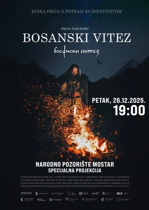 U Narodnom pozorištu u Mostaru, u petak, 26.12.2025. godine, bit će upriličena specijalna projekcija novog dokumentarnog filma „Bosanski vitez“ producenta Adnana Ćuhare i reditelja Tarika Hodžića, sa početkom u 19 sati. Ulaz je slobodan, uz obavezno prethodno preuzimanje ulaznica na blagajni NPM-a.
