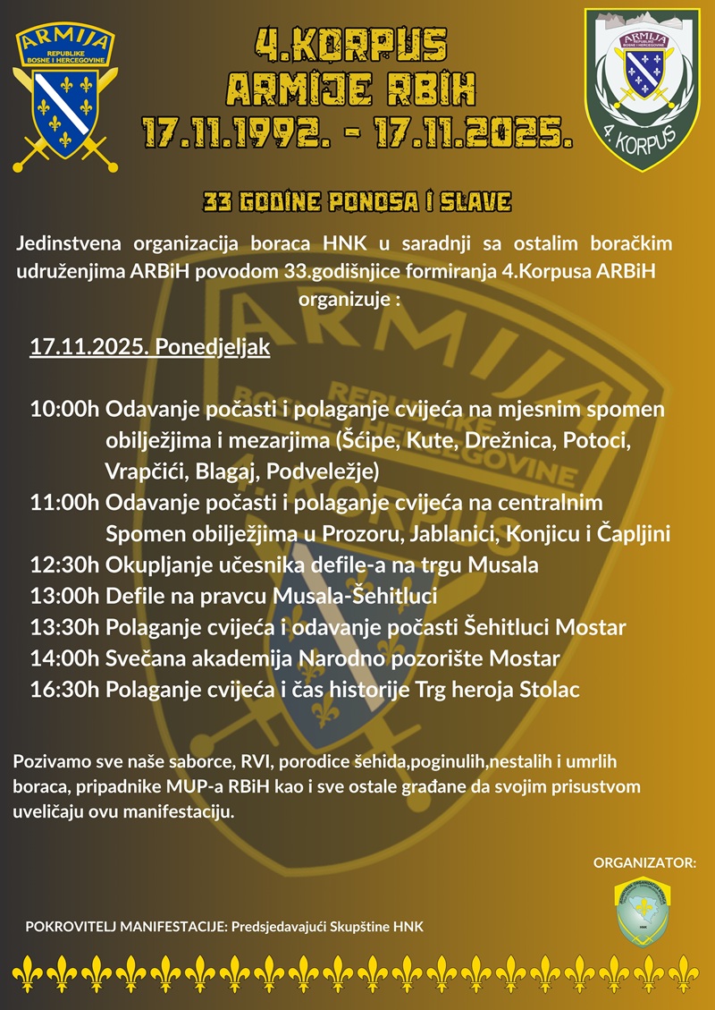 Obilježavanje 33. godišnjice formiranja Četvrtog korpusa Armije Republike Bosne i Hercegovine, bit će održano u ponedjeljak 17. 11. 2025. godine.