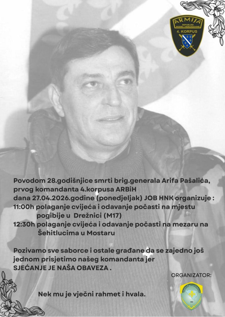 Jedinstvena organizacija boraca (JOB) Hercegovačko-neretvanskog kantona (HNK) u ponedjeljak 28. 4. 2026. godine obilježit će 28.godišnjicu tragične smrti brigadnog generala Arifa Pašalića, prvog komandanta 4.korpusa ARBiH.