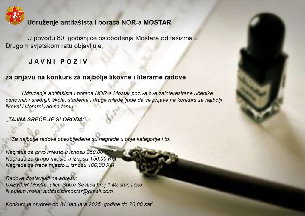 Udruženje antifašista i boraca NOR-a (UABNOR) Mostar, objavilo je Javni poziv za prijavu na konkurs za najbolje likovne i literarne radove, o temi “Tajna sreće je sloboda”, povodom 80. godišnjice oslobođenja Mostara od fašizma u Drugom svjetskom ratu.