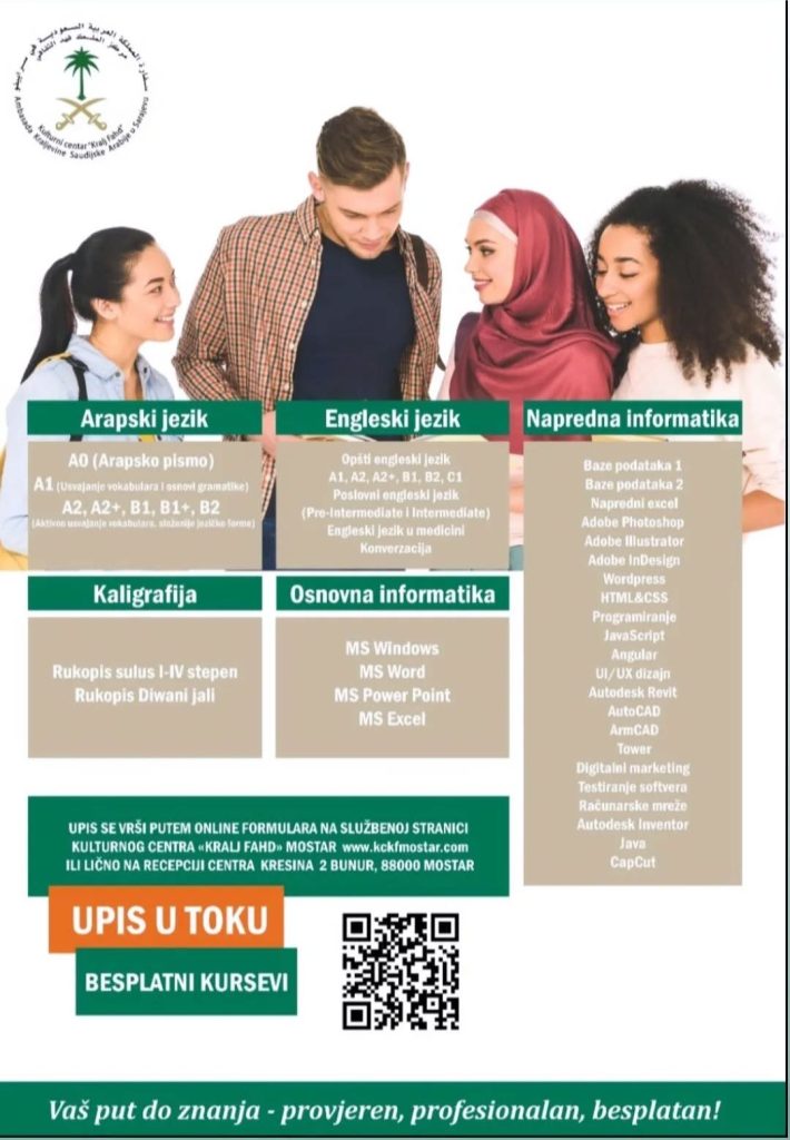 Kulturni Centar “Kralj Fahd” – ogranak Mostar vrši upis na besplatne kursevi osnove i napredna informatika, arapski i engleski jezik ,te kaligrafija.