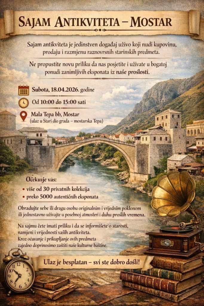 Prvi sajam antikviteta u Mostaru održat će se u subotu, 18. aprila 2026. godine na Maloj Tepi u organizaciji mostarskih kolekcionara antikvitetima Nermina Gabele i Derviša Deše Travnjaka.
