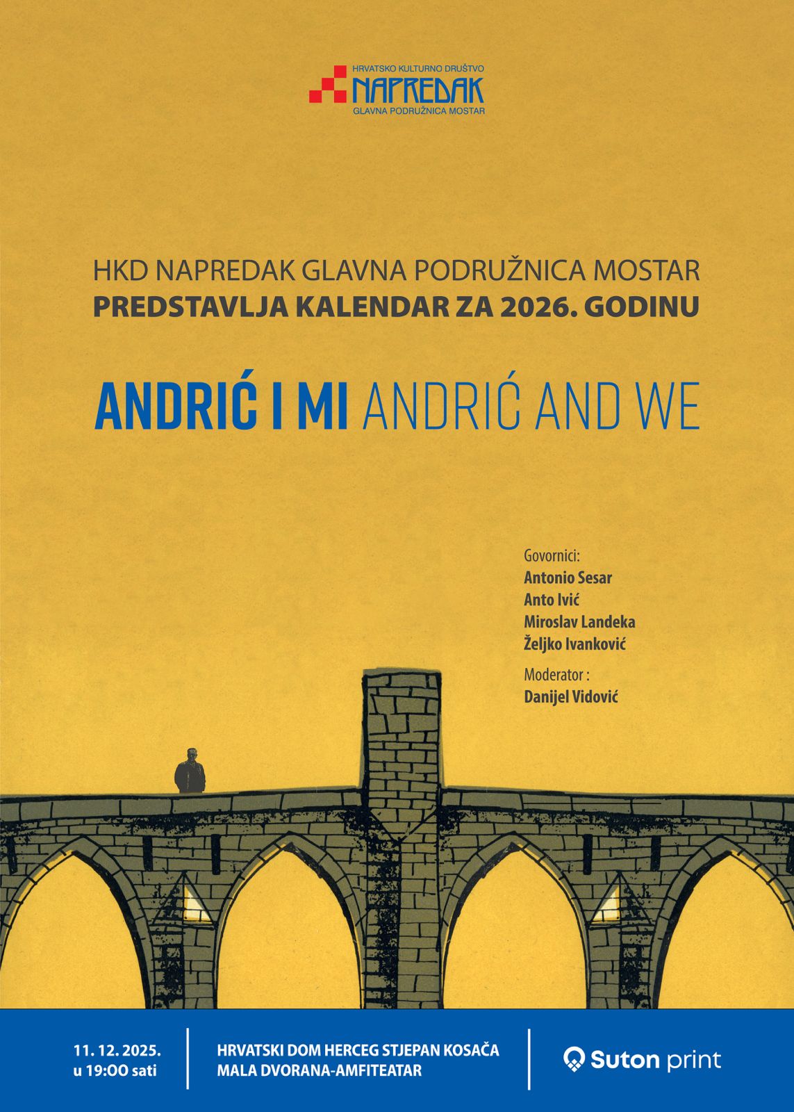 Hrvatsko kulturno društvo (HKD) Napredak Glavna podružnica Mostar za večeras u 19.00 sati u amfiteatru doma herceg Stjepana Kosače najavilo je predstavljanje Napretkovog zidnog katoličkog imendanskog kalendara za 2026. godinu pod nazivom “Andrić i mi”.