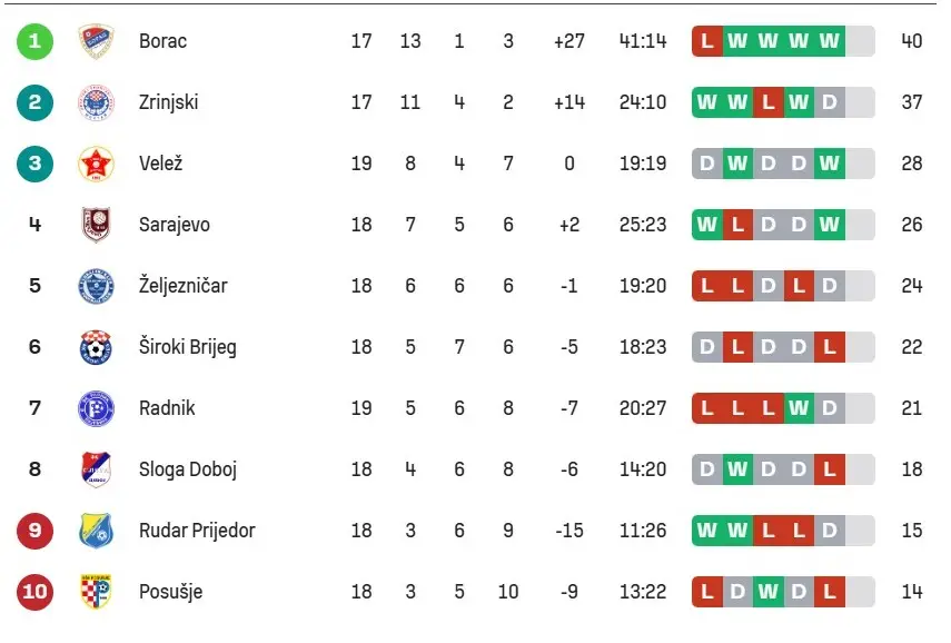 S ova tri boda Velež je došao do ukupno 28 bodova i trećeg mjesta na tabeli, dok je Sloga sa 18 bodova i dalje na osmom mjestu prvenstvene tabele.