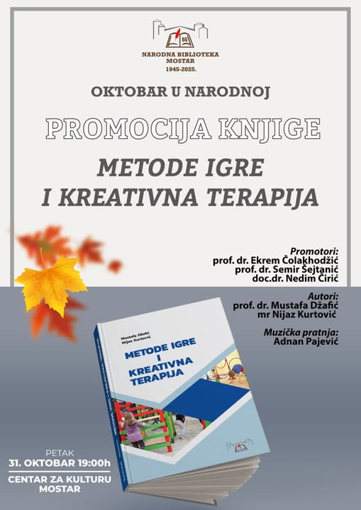 Narodna biblioteka Mostar manifestaciju posvećenu mjesecu knjige “Oktobar u Narodnoj”, završava večerašnjom promocijom knjige “Metode igre i kreativna terapija” autora prof. dr. Mustafe Džafića i mr. Nijaza Kurtovića.