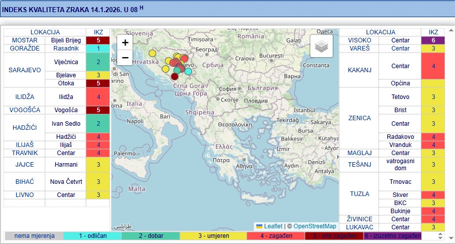 Prema podacima Federalnog hidrometeorološkog zavoda (FHMZ-a) indeks kvalitete zraka u 08:00 sati, u Mostaru je označen kao vrlo zagađen.